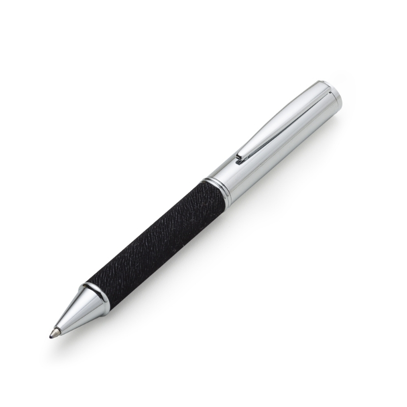 Caneta metal prata com detalhe em papel reciclado, versão brilhante e fosca. Possui anel superior, dois anéis centrais e um anel inferior, com gravação a laser.