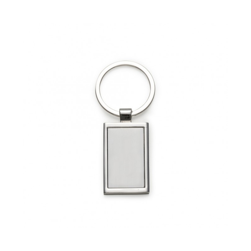 Chaveiro de metal retangular com chapa central, verso liso, com gravação a laser.