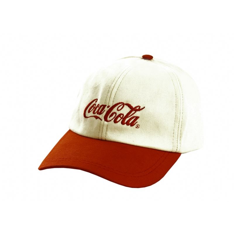 Boné personalizado modelo 6 gomos em brim peletizado, na cor bege com detalhes em vermelho, com costura na aba com regulador metal, ou plástico.