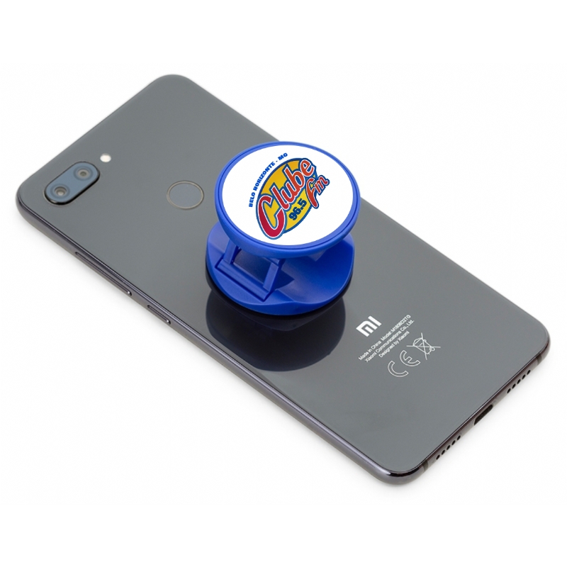 Suporte retrátil para celular em material plástico com verso adesivado (3M). Utilização como “anel anti-furto” ou suporte de sustentação para o celular, com gravação etiqueta resinada.