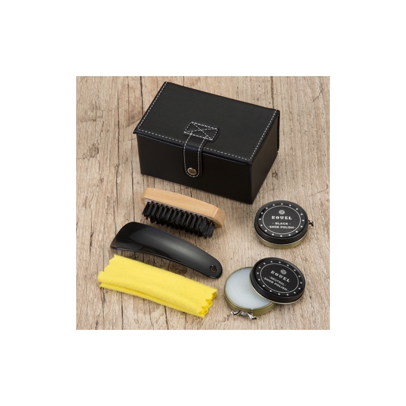 Kit engraxate estojo em couro sintético com 5 peças, costura branca e botão para abrir/fechar. Possui cera preta, cera incolor(suporte da cera em metal, para abrir basta girar a trava), calçadeira, flanela amarela e uma escova(acompanha proteção plástica). Parte interna com dois elástico para encaixar as ceras e suporte com botão para prender a escova, com gravação a laser.
